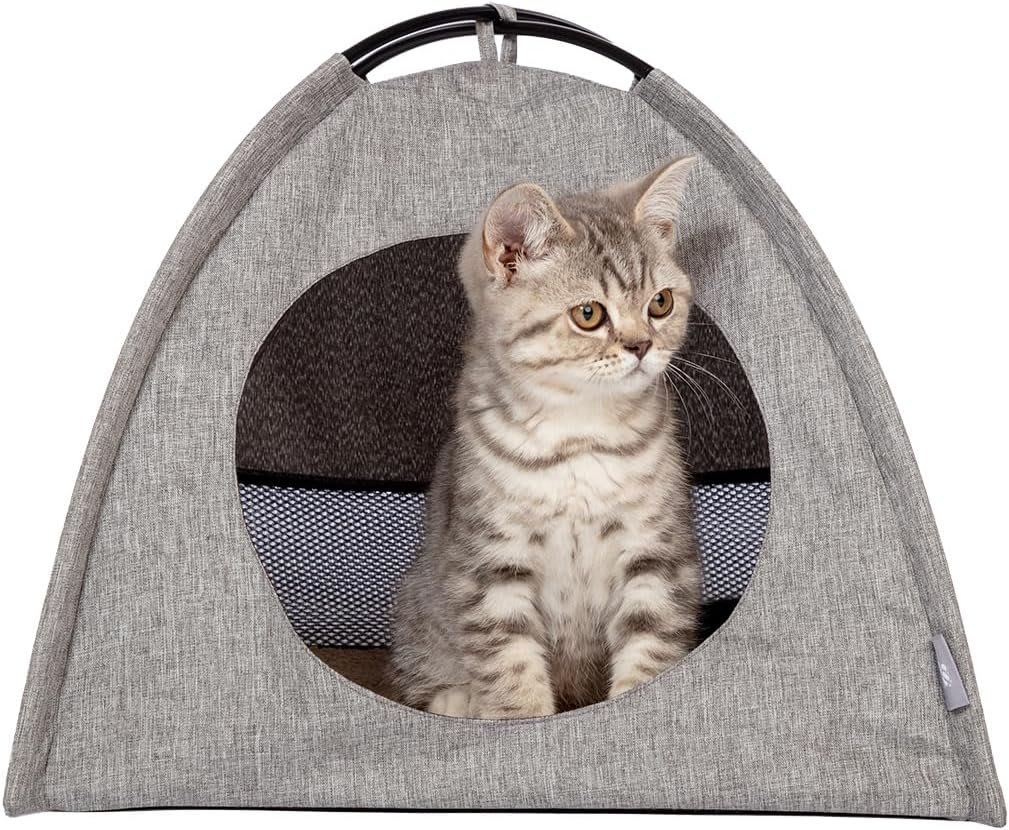Made with water resistant and breathable fabrics, this unique cat tent offers your cat a fun hideaway and is available in grey.