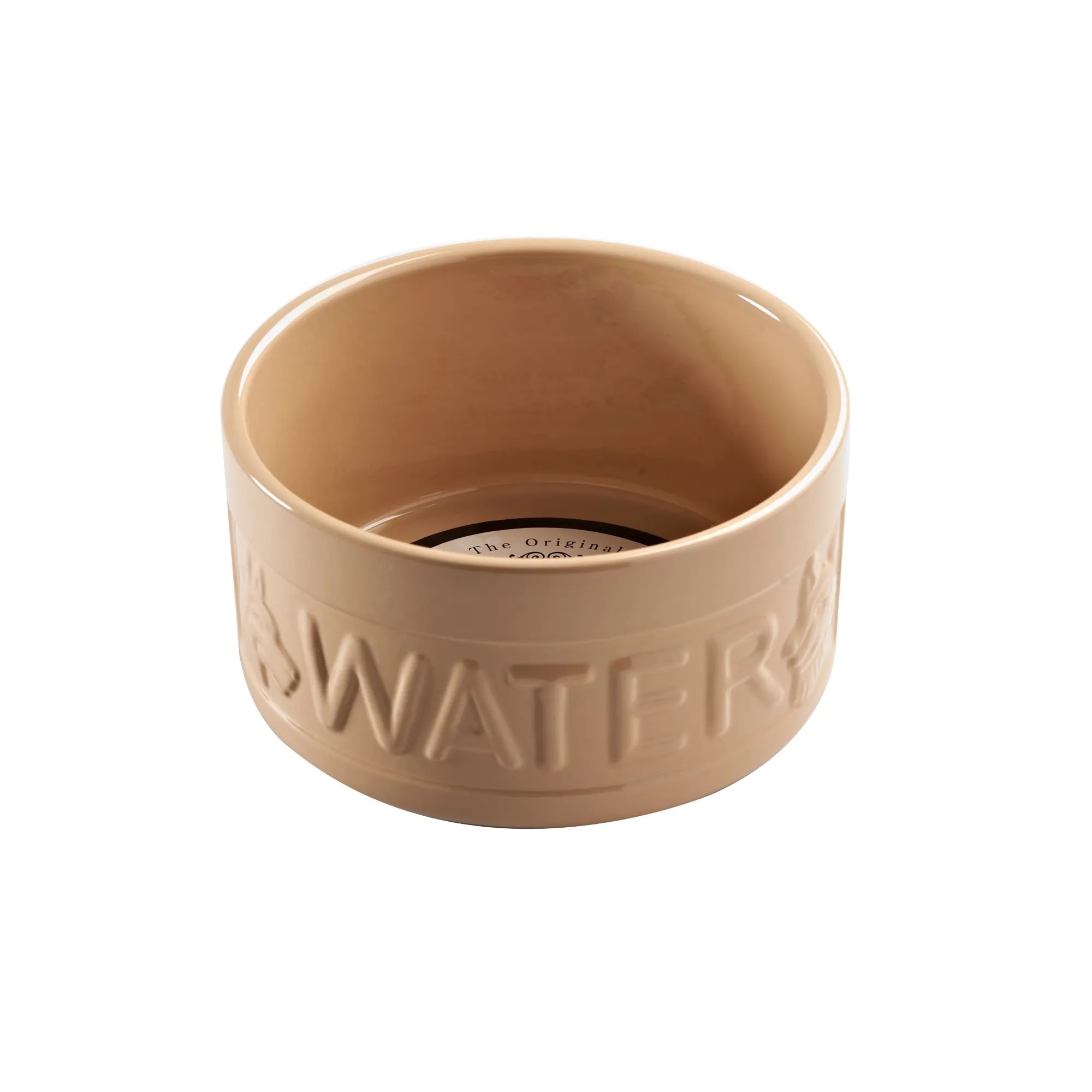 The stoneware dog water bowl is brown and has an embossed “WATER” and dog head silhouette around the side. The bowls measure approximately: